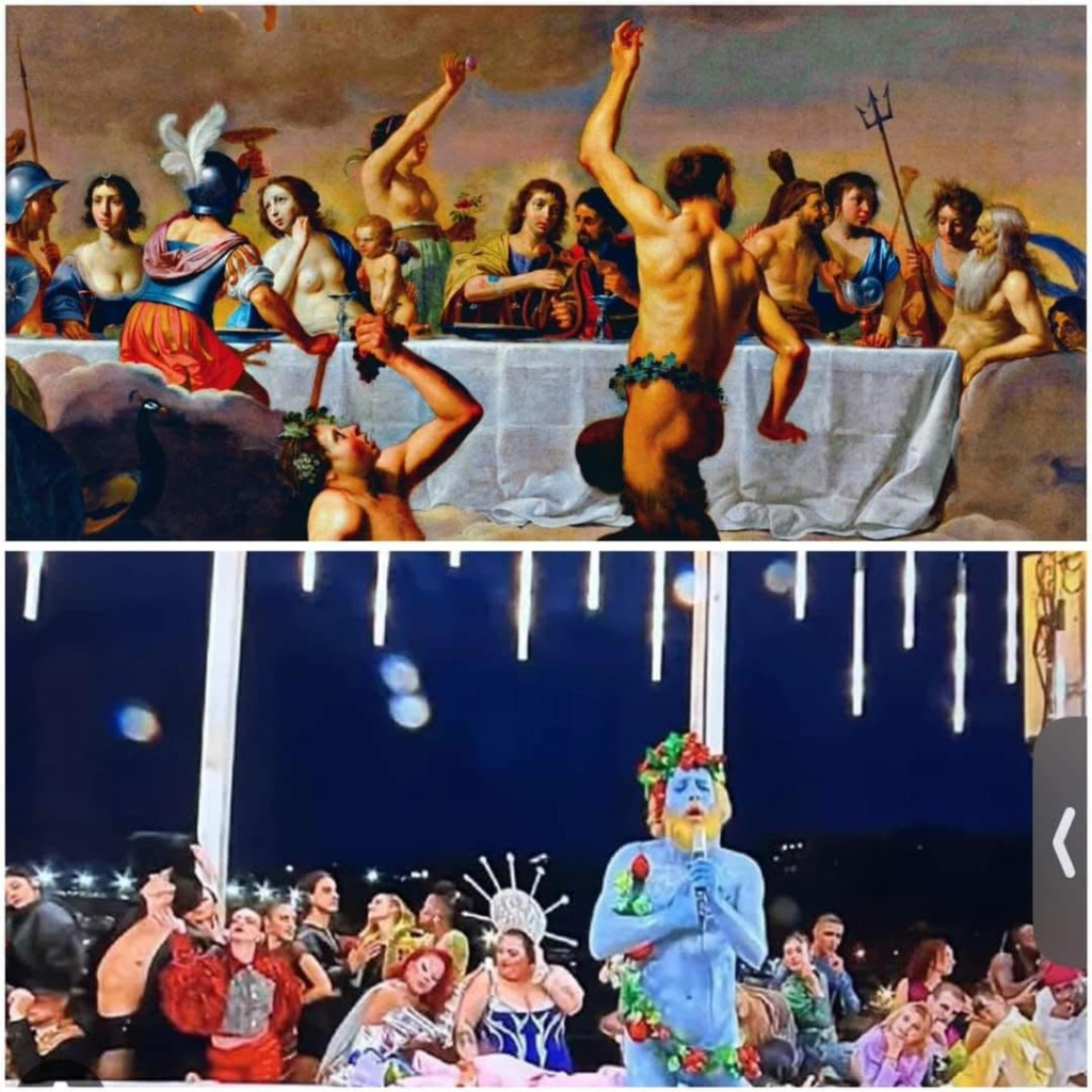 And finally, there was the great misreading — the neo‑modern Christian world confidently insisting that the homage to Dionysus and the festival of Bacchus was actually some kind of Leonardo da Vinci Last Supper tribute gone sideways. The irony is almost too rich. Da Vinci’s Last Supper — one of the most recognized masterpieces on the planet — began as a dining‑hall mural, a quiet, intimate moment of tension and betrayal. Meanwhile, the Olympic scene was a vibrant, ecstatic celebration of Dionysian myth, joy, and embodied freedom. Two entirely different worlds, two entirely different intentions.