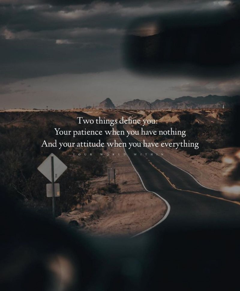 “Two things define you Your patience when you have nothing and your attitude when you have everything.”
